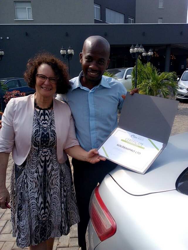 Mike Anyakudo, CEO Goldenspiro Ltd receiving our partnership certificate from Karin Zimmermann, our partner from Germany